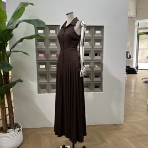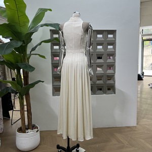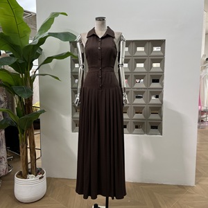 亚马逊简约御姐风法式百搭潮流收腰丝麻翻领无袖长款连衣裙垂感女