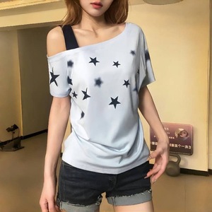 アメリカンスタープリント斜め肩サスペンダー半袖Tシャツレディース夏ニッチホットガールスタイルシックなデザイントップス新しいスタイル