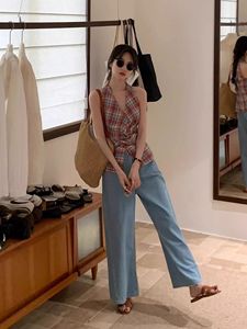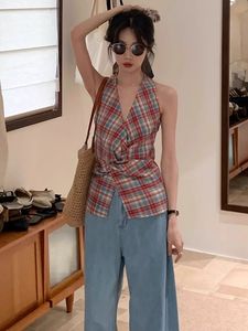 法式V领格子绑带挂脖背心2025夏季新款外穿独特收腰显瘦无袖上衣