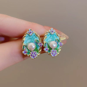 モネガーデンパールイヤリング女性のカラフルな滴釉油絵フラワーイヤリングバロックレトロ気質パールイヤリング