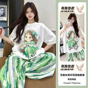 带胸垫新款睡衣女2025夏季短袖长裤卡通蝴蝶结女孩家居服可外穿