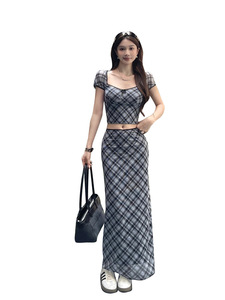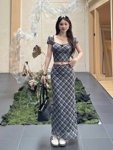 イリヤ レトロチェック柄スカートスーツロングスカートレディース夏個性シンプル半袖スカート LH25148XGG
