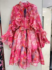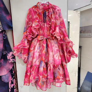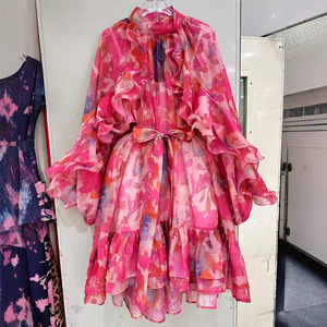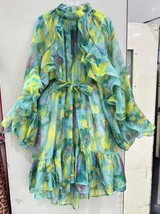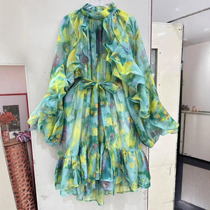 ヨーロッパとアメリカのクロスボーダー2025新しいスタイルのエレガントで知的なスタイルのレースアップステッチ大きな裾のベルスリーブプリントドレス