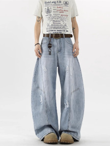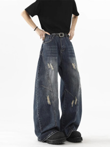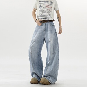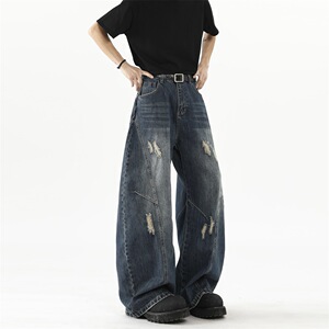 牛仔裤男女潮牌设计感宽松解构百搭直筒阔腿长裤美式复古破洞弯刀