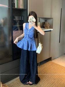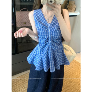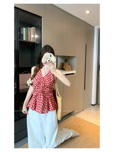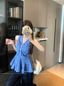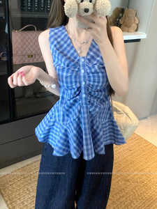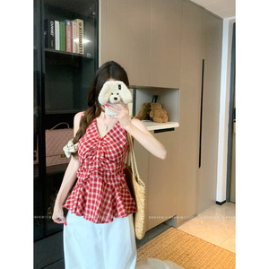 夏のファッショナブルなチェック柄 V ネックデザインの女性用ベストサスペンダー、甘いホットガールのウエスト痩身、パーソナライズされた多用途トップストレンディなイン