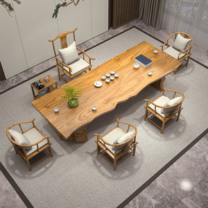 新中式原木大板办公室实木泡茶桌椅组合家用客厅泡茶台大板桌茶室
