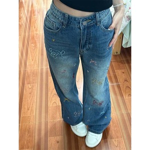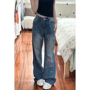 【新塘牛仔全店现货】美式复古卡通直筒牛仔裤女高腰显瘦宽松阔腿