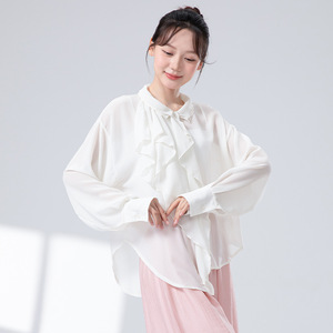 女性用モダンダンス服、新しいパールシフォンラペル長袖シャツ、日焼け止めシャツ、エレガントな練習服