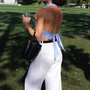 2025夏季新款度假风挂脖大露背简约通勤撞色条纹系带无袖开襟衬衫