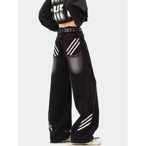 美式条纹拼接阔腿牛仔裤男潮流新款潮牌宽松水洗做旧直筒阔腿长裤