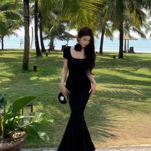 ヘプバーン風フレンチスタイル夏新作プリーツピュアデューティウエスト半袖ヒップカバーフィッシュテールドレスドレープロングスカート