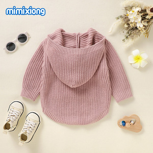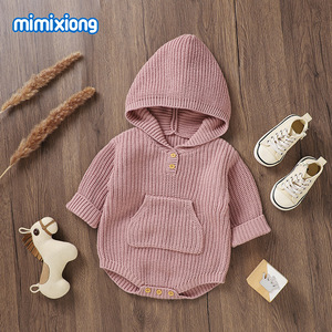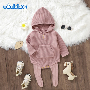 ins热卖春秋季新款婴幼儿纯色针织连帽连体三角哈衣爬服套装