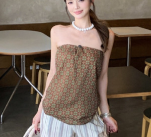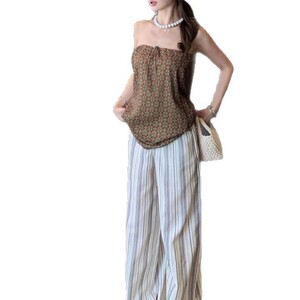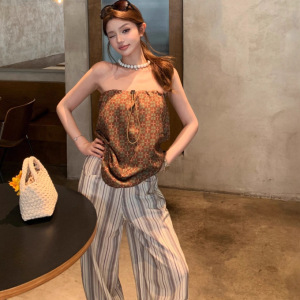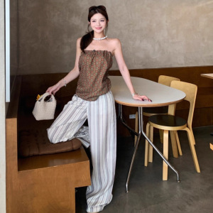リアルショットフレンチリゾートスタイルレトロプリントチェック柄チューブトップ+ワイドレッグ縦ストライプワイドレッグカジュアルパンツスーツ