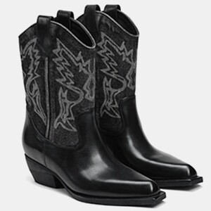 牛皮~蔡文静同款复古V口小方头西部牛仔靴复古短靴刺绣尖头中筒靴