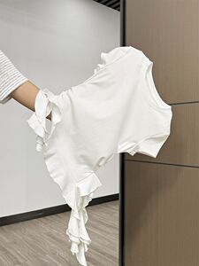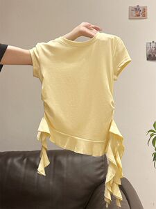 奶黄色圆领正肩短袖t恤女2025夏季新款不规则下摆荷叶边修身上衣