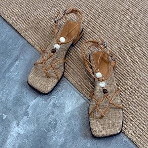 羊皮版~新款度假波西米亚风夹脚罗马鞋女软底粗跟方头一字带凉鞋