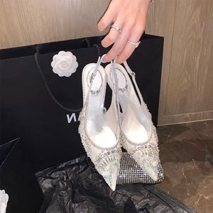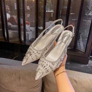 2025新款网纱水钻珍珠高跟鞋女夏细跟尖头浅口凉鞋时尚后空平底鞋