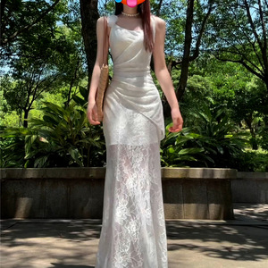 フレンチスタイルの高級ホワイトレースサスペンダードレス女性用2025年夏新作スリムフィットヒップカバーロングスカート