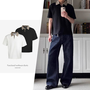 千鸟格拼接polo衫短袖男款美式老钱风正肩t恤cleanfit翻领半截袖