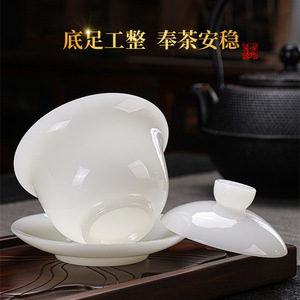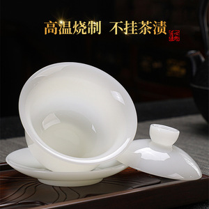 高冰种玉瓷悬停盖碗三件套高档个人专用陶瓷可悬停旋转不烫手三才