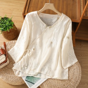 新しい刺繍入りコットンとリネン混紡のミッドスリーブシャツ、レトロで芸術的なルーズで多用途な花柄の薄いトップ、女性用アプリコットピンク