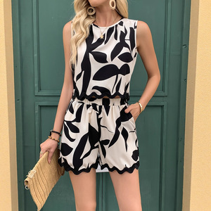 2025 ヨーロッパとアメリカのクロスボーダー Amazon 独立ステーション人気の春の女性の気質プリントノースリーブファッションショーツスーツ
