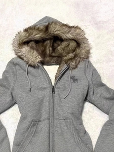 美式复古Vintage古着 加绒收腰连帽卫衣女秋冬季开衫毛领外套上衣