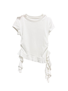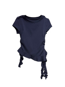 ネイビーブルー不規則なフリルラウンドネック半袖Tシャツレディース夏の新しいハイエンドホットガールスリムフィットトップトレンディ