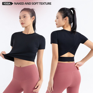 秋冬新款瑜伽服短袖女 裸感露脐开背运动上衣 修身速干健身服t恤