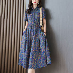 綿とリネンの花柄ドレス女性のための 2025 夏の新しいルーズウエスト痩身ママドレス年齢を減らす半袖スカート