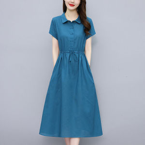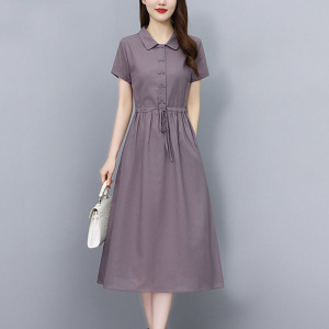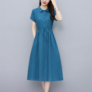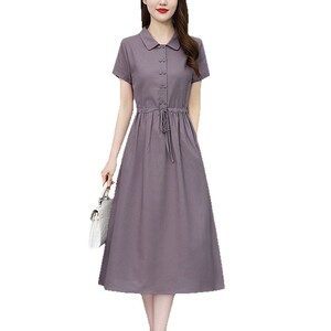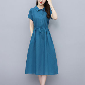 韩版纯色复古文艺棉麻连衣裙夏季新款娃娃领减龄时尚收腰大摆裙