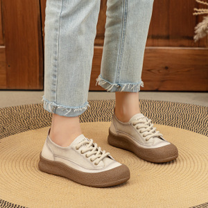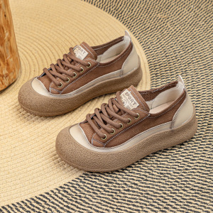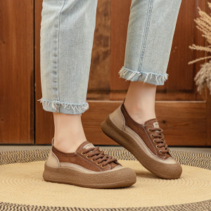 女性のための第一層牛革レトロシューズ 2024 秋と冬の新しい厚底レースアップソフト表面カジュアルフラットシューズ女性のための