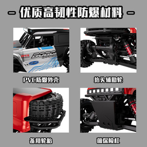 半封闭底盘、全比例四驱大脚越野车、适应场地广、有刷/无刷电机、大容量锂电池、LED灯、七色车顶