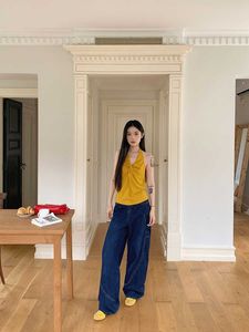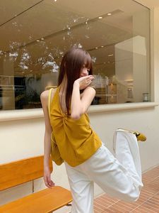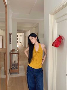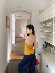 法式辣妹v领挂脖针织刺绣露背背心女夏外穿多巴胺显白柠檬黄上衣