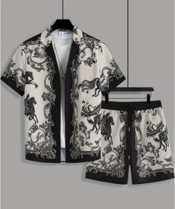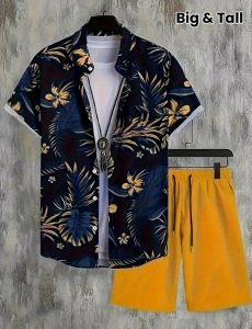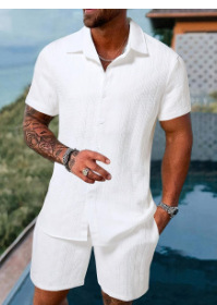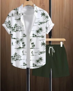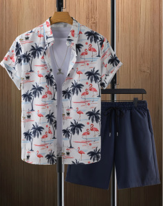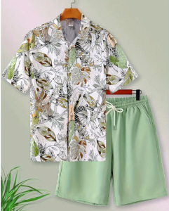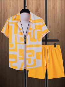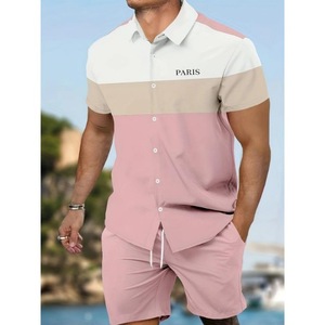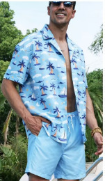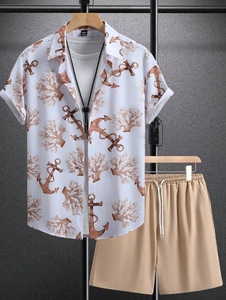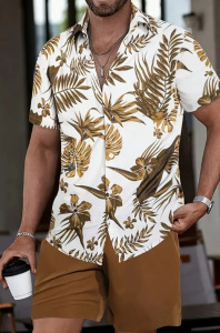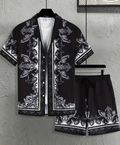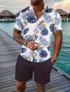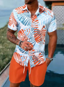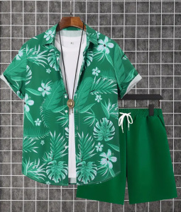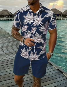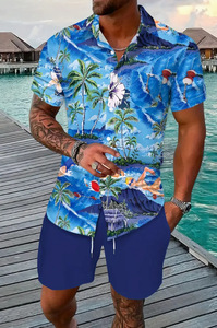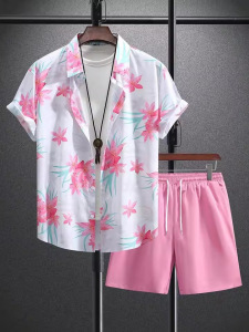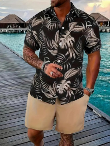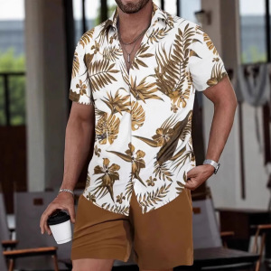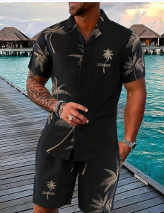 トレンドの新作ハワイアンクロスボーダー夏メンズ人気の万能ラペルカジュアル半袖シャツとショーツセット