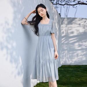 影系粉色雪纺连衣裙女2025夏季新款法式收腰巨好看欧若风方领裙子