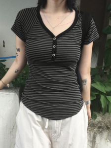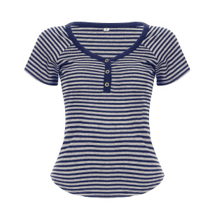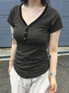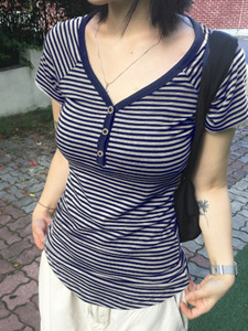 ヨーロッパとアメリカのラグランスリーブストライプコントラストカラーボタンTシャツVネックスリムフィットカジュアルで快適なベーシック万能トップ