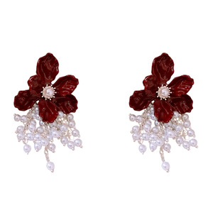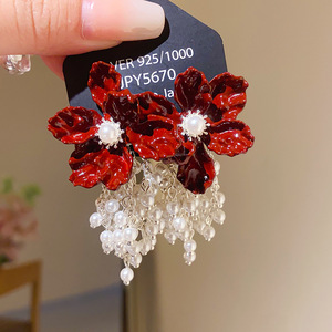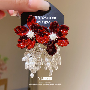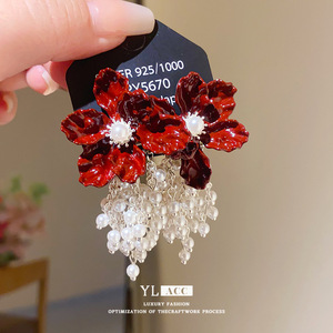 シルバー針ヨーロッパとアメリカの模造真珠オイルドリップフラワータッセルツーウェイイヤリングファッショナブルなハイエンドニッチパーソナライズイヤリング女性用