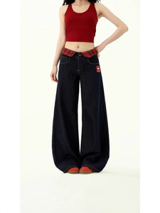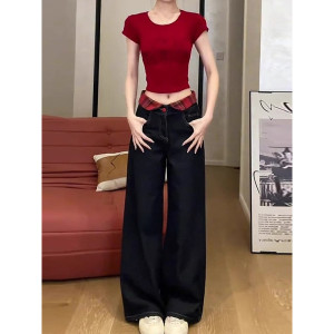 美式复古猫咪刺绣牛仔裤女夏季高腰显瘦宽松格子拼接直筒阔腿裤潮