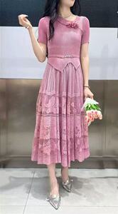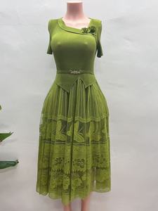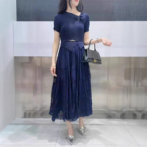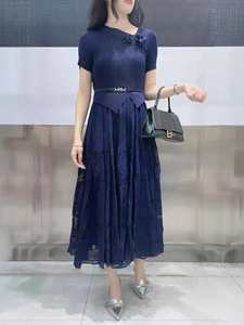 2025夏季新款蝴蝶结斜领蕾丝网纱刺绣拼接假两件仙女连衣裙女装