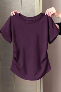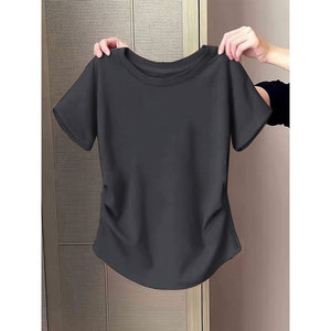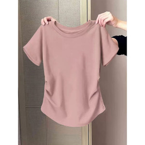 ソリッドカラープリーツ半袖Tシャツレディース新作夏スリムウエストシックなデザインラウンドネックTシャツトップ