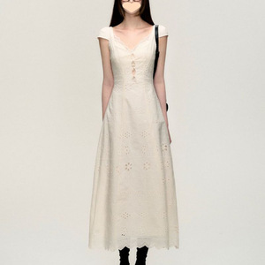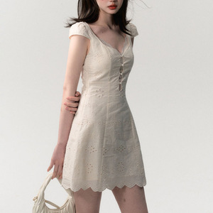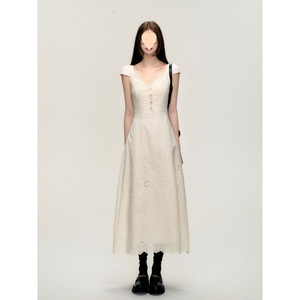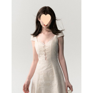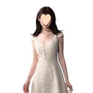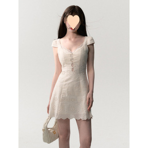 新品法式复古重工镂空领连衣裙女夏季纯欲设计感小白裙麻拼接