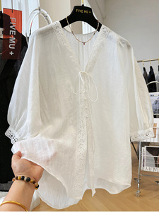 高級Vネックレース半袖シャツカーディガンレディース夏薄手ラミーシャツゆったりフレンチトップ