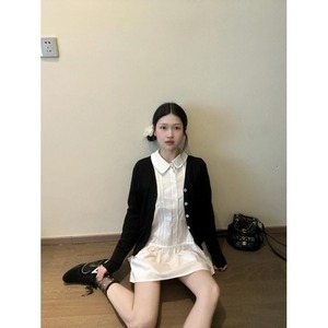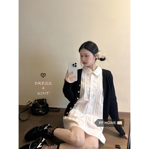 PPHOME甜美白色娃娃领长袖连衣裙女春季针织开衫外套韩系穿搭套装