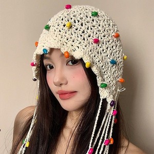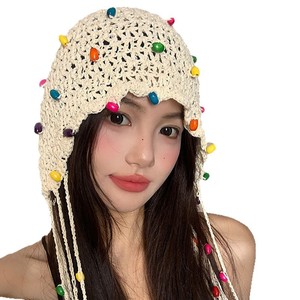 女性用の春夏の手織り中空つば帽子、エスニックスタイルのフックフラワー、タッセルストラップ、プルオーバーニット帽、多用途