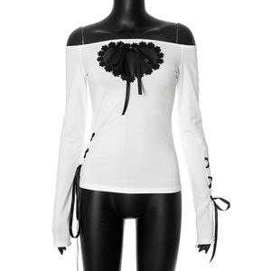 欧美2025跨境外贸辣妹镂空设计花边爱心修身上衣长袖一字肩T恤女