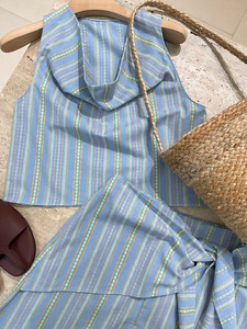 2025 春夏ホリデーブルー刺繍生地不規則なノースリーブベスト/ショートキュロット/ロングワイドレッグスーツ