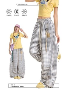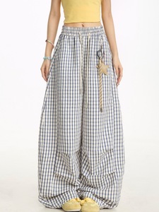 スターペンダントパンツブルーチェック柄ストレートパンツ女性の夏の2025新しいスタイルドレープレイジーカジュアルワイドレッグパンツイン