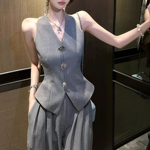 2025 光彩夺目夏季气质时尚闪钻无袖上衣马甲+银色银河裤子套装夏