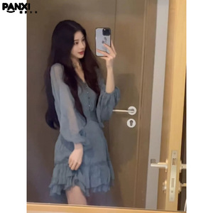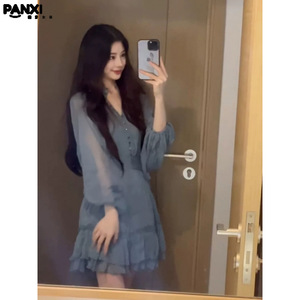 フレンチVネックブルーシフォンドレスレディースサマーデザインニッチウエスト気質ユニークで美しいショートスカート